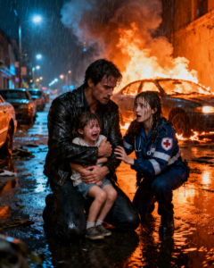 When I finally pushed myself up, coughing, blinking through the haze, the car was fully engulfed, flames consuming what was left, and there was no going back, no saving anyone else, just the 2 of us in the aftermath. She was still in my arms, quieter now, her small fingers gripping my shirt like I was the only solid thing left in her world.