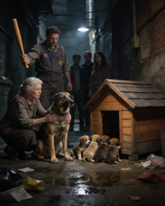 Immediately, the dog moved, placing herself in front of her puppies. Her weak body shielded them, despite her trembling legs and visible exhaustion.
