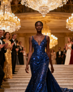 Wrapped in midnight-blue silk that shimmered like the night sky. Thousands of crystals caught the chandelier light, scattering it across the room in breathtaking brilliance. Her posture was effortless. Her expression calm. Her presence… commanding.