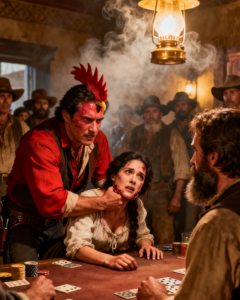 The Gallo Rojo cantina smelled of cheap tobacco, sour mezcal, and the kind of regret men learned to swallow instead of confess. Outside, the autumn wind scraped against the stone streets of the mining town, carrying dust, whispers, and the quiet ruin of men who had already gambled away everything worth keeping.