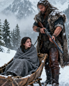 He was enormous—broad-shouldered beneath layers of worn leather and wool, a bear pelt draped over his back like armor. Frost clung to his beard. A rifle hung across his shoulder. His face held no softness, no hesitation.